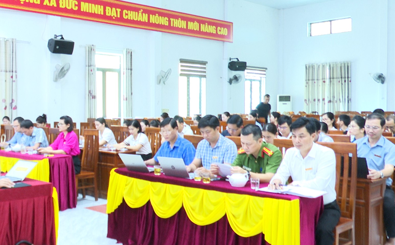 Đồng chí Cù Thị Mỹ Hiệp, Bí thư Đảng ủy-Chủ tịch HĐND xã; đồng chí Nghiêm Sỹ Đông, Phó Bí thư Thường trực Đảng ủy và đồng chí Nguyễn Tiến Thắng, Phó Bí thư Đảng ủy-Chủ tịch UBND xã chủ trì hội nghị.