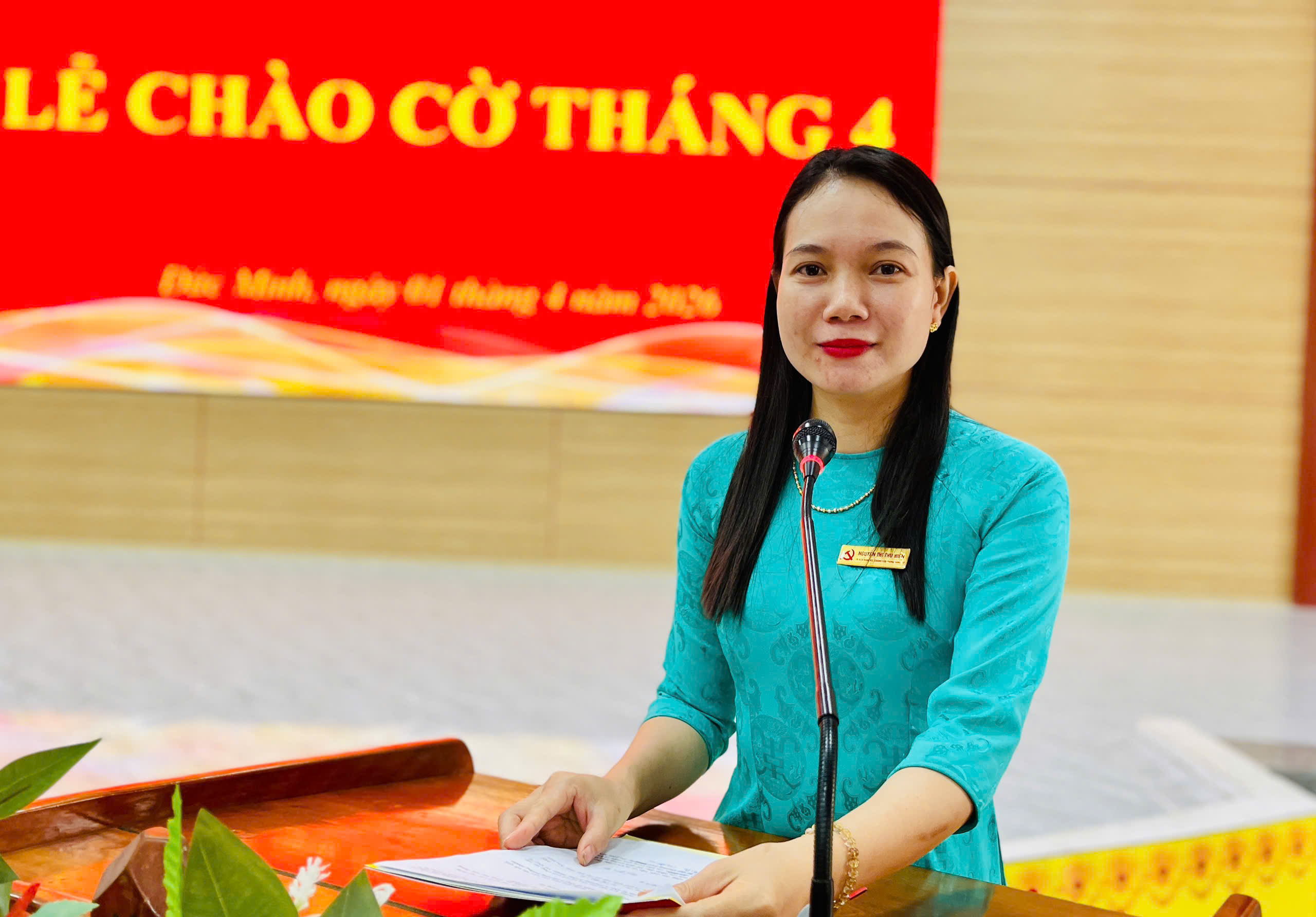 Đồng chí Nguyễn Thị Thu Hiền, Chánh Văn phòng Đảng ủy xã báo cáo kết quả thực hiện nhiệm vụ quý 1/2026 tại buổi lễ.